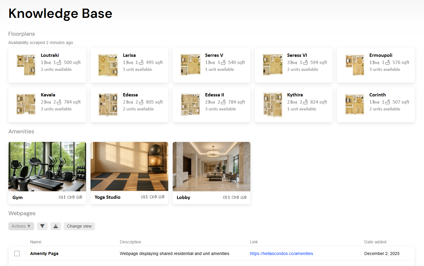 Interface for updating your assistant's knowledge base by uploading or deleting media and information about your property. Efficiently customize its looks and functions all in one place.